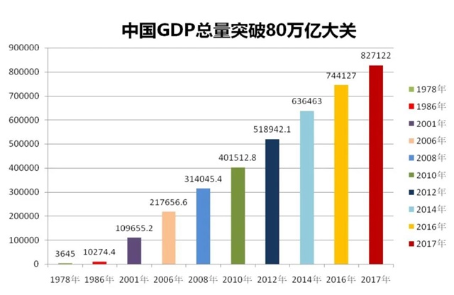 到2017年,中国的进出口总额已超过了4万亿美元,成为全球第一贸易大国,外汇储备最高曾接近4万亿美元,GDP总量也增加到82万多亿,年均增长9.8%,平均每8年翻一番。
