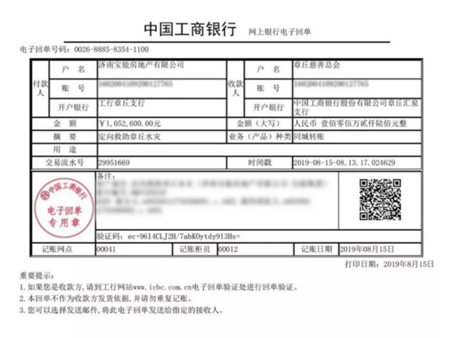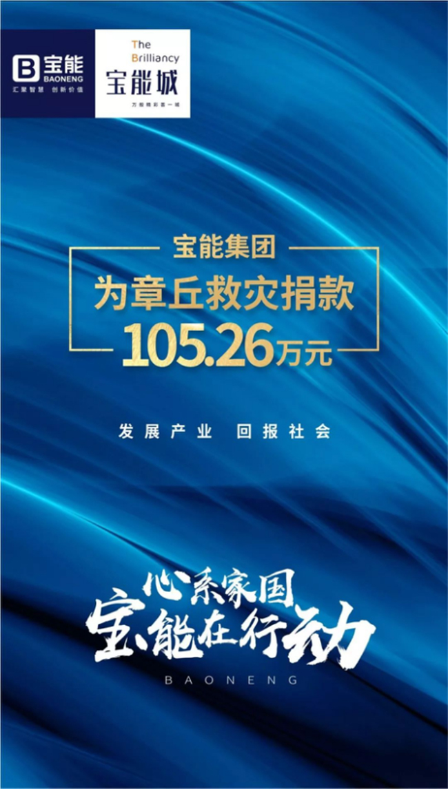 一方有难,八方支援,宝能集团时刻关注章丘台风灾情,快速响应政府号召,积极践行企业社会责任,第一时间投入灾后重建工作。8月15日,宝能集团为救助章丘水灾捐款100万元,并号召济南宝能房地产有限公司全体员工募捐筹得善款5.26万元,一并用于开展灾后重建工作,以使章丘受灾人民群众尽快恢复正常工作生活。洪水无情,人有情。宝能公益,一直在路上。