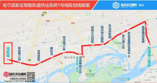 据悉,智轨1号线,一期将建设宝能城、融创商业中心、哈商大至松浦观江国际等13处站点,并设置北岸明珠小区站与地铁二号线进行换乘。