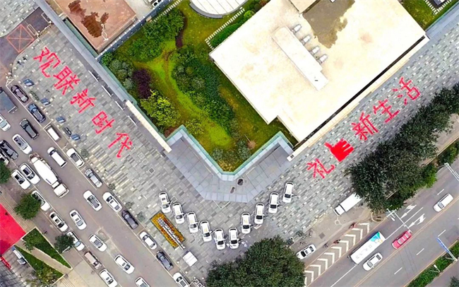 巡视车队前往哈尔滨、长春、沈阳等老工业基地,并在东北第一高楼沈阳宝能GFC楼下,摆出V字造型,用红绸点亮观联新时代,礼赞新生活。