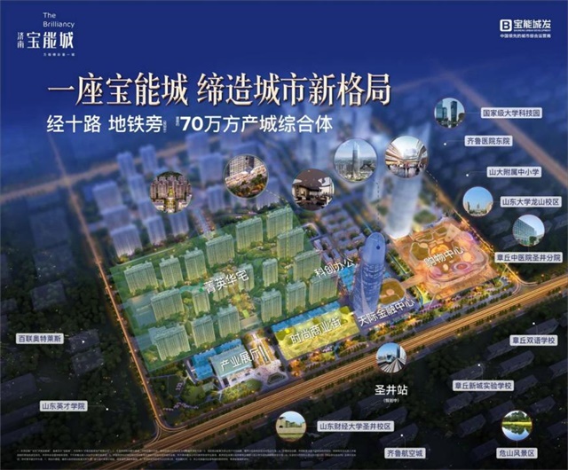 一座宝能城,创启城市4.0新时代。作为经十路的新封面、济东新城的新坐标,济南宝能城南靠地铁R4线(规划中),建成以后将是济东的商业新中芯,规划天际金融中心、宝能·allcity购物中心、时尚商业街、科创办公、菁英华宅五大业态,汇聚了商、居、产、城四大城市功能,将带给济东乃至济南新的生活形态,以强大的赋能力量,汇集周边资源,为济东立芯,创启城市4.0新时代!