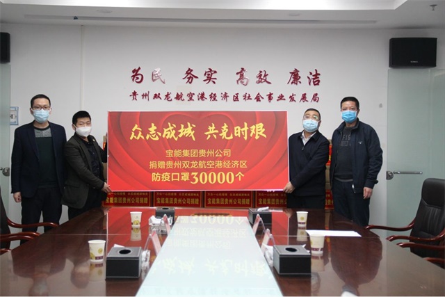 3月18日,正值全省复工复产浪潮之际,宝能集团贵州公司向贵州双龙航空港经济区捐赠防疫口罩3万个,支持双龙航空经济区按时复工复产,防疫第一线有所保障。党政办主任赵主任、社事局局长李局长对于宝能集团的捐赠表达了衷心的感谢。同时,宝能城发集团贵阳公司常务副总经理吕帅军说到:“人要有个人的担当,企业要有企业的责任。作为经济区的一员,贵阳宝能人希望能在抗‘疫’战斗中奉献出自己力所能及的力量。”